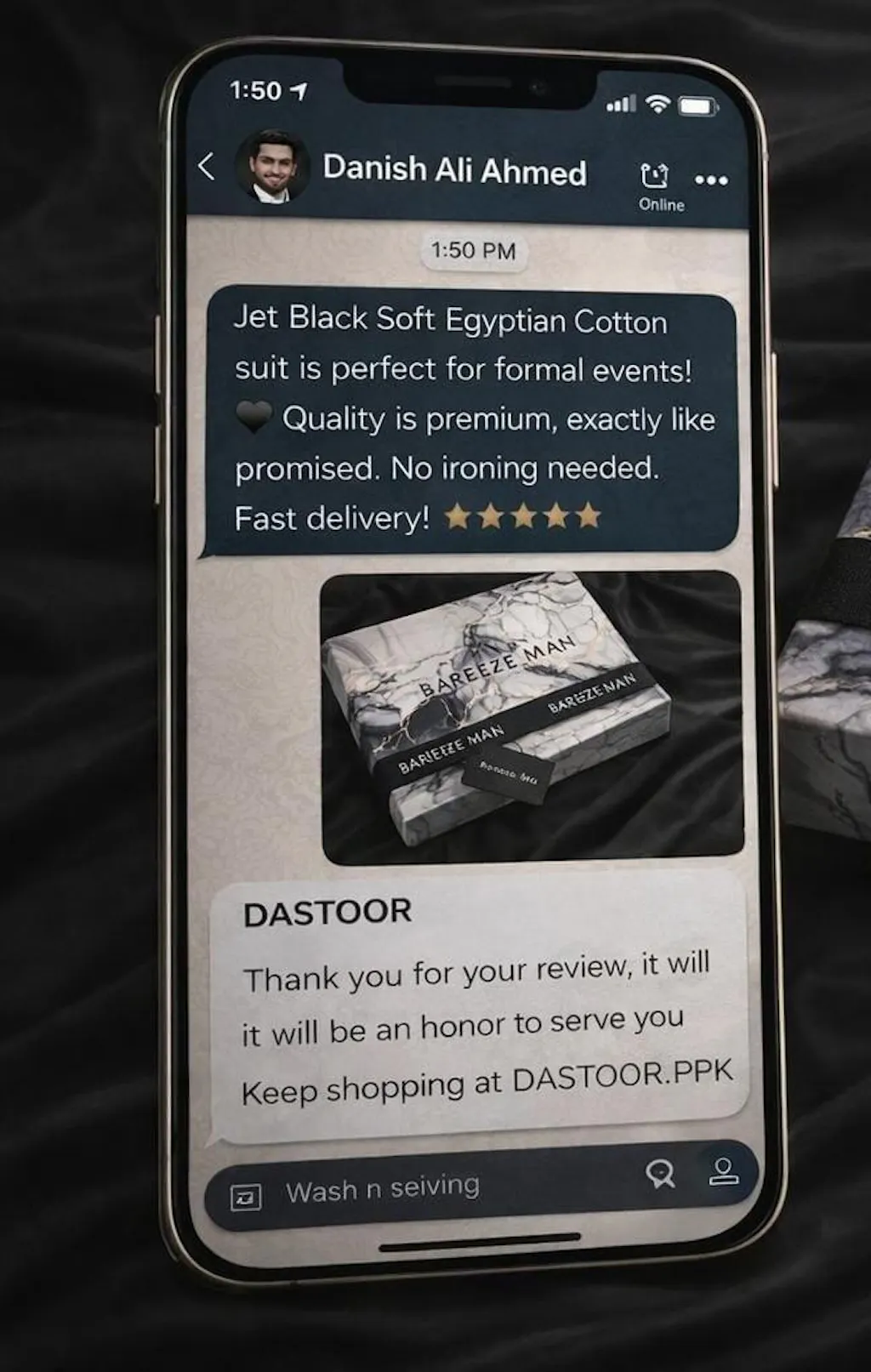 "Jet Black Soft Egyptian Cotton suit is perfect for formal events! 🖤 Quality is premium, exactly like promised. Fast delivery! ⭐⭐⭐⭐⭐"