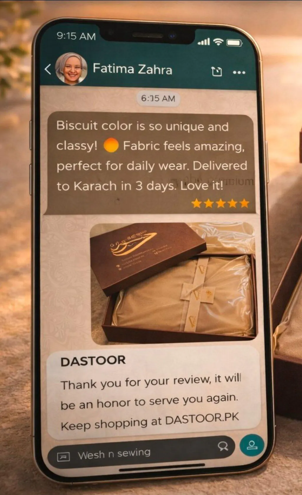 "Biscuit color is so unique and classy! 💛 Fabric feels amazing, perfect for daily wear. Delivered to Karachi in 3 days. Love it! ⭐⭐⭐⭐⭐"