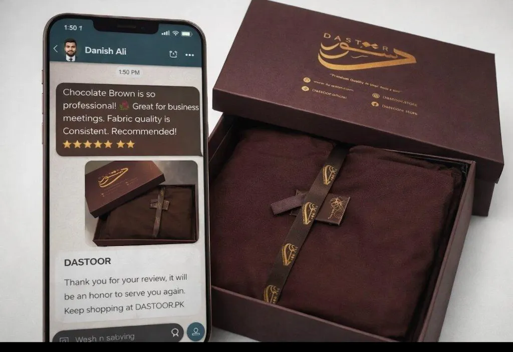 "Just received my Pearl White suit! 😍 MashaAllah so elegant and pure. Wash n wear fabric is super soft. Delivered to Lahore in 2 days! ⭐⭐⭐⭐⭐"