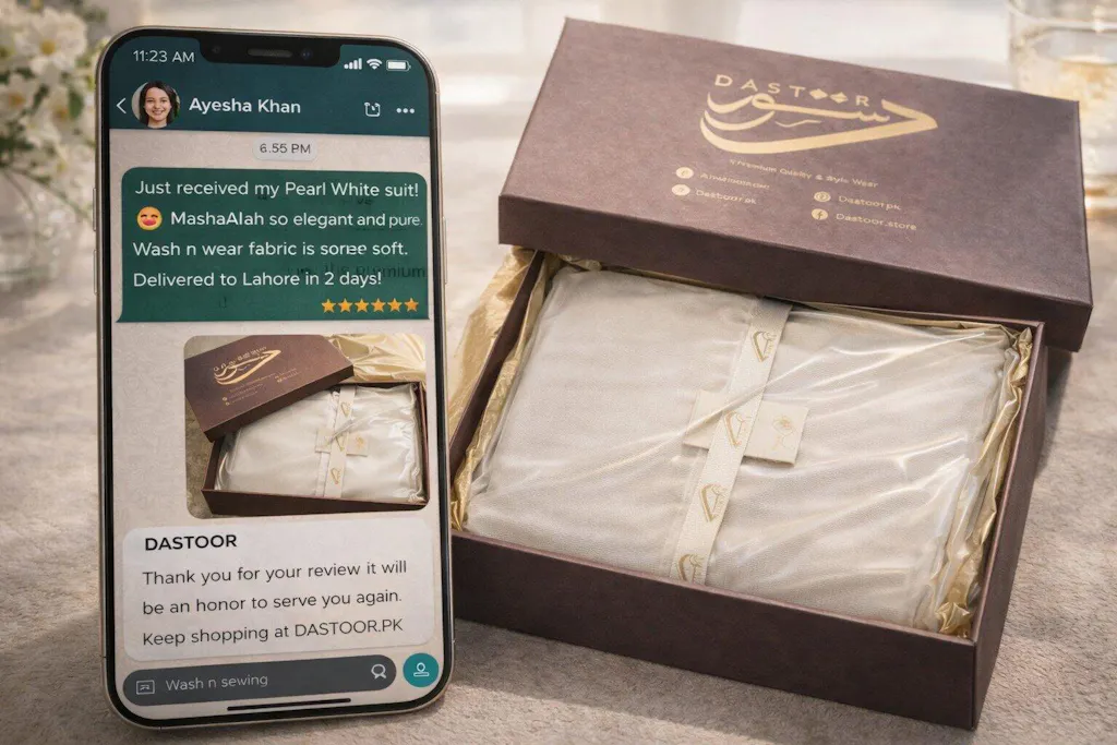 "Just received my Pearl White suit! 😍 MashaAllah so elegant and pure. Wash n wear fabric is super soft. Delivered to Lahore in 2 days! ⭐⭐⭐⭐⭐"
