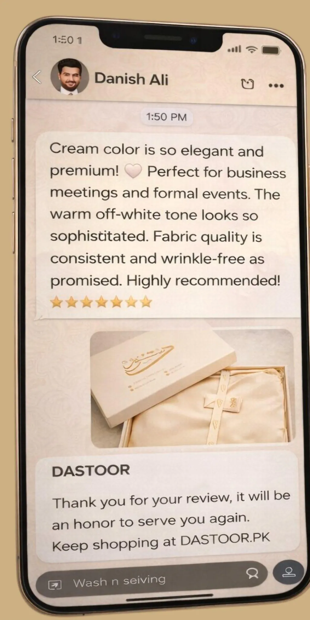 "Just received my Pearl White suit! 😍 MashaAllah so elegant and pure. Wash n wear fabric is super soft. Delivered to Lahore in 2 days! ⭐⭐⭐⭐⭐"